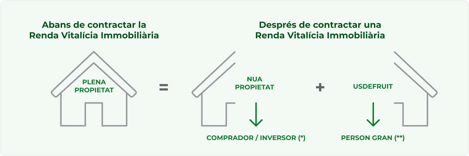 Es tracta d’un contracte, formalitzat amb una escriptura pública davant de notari, mitjançant el qual la persona gran propietària d’un habitatge en ven la nua propietat, però se’n reserva per a si mateixa l’usdefruit en propietat, és a dir, el dret d’ús i gaudi.